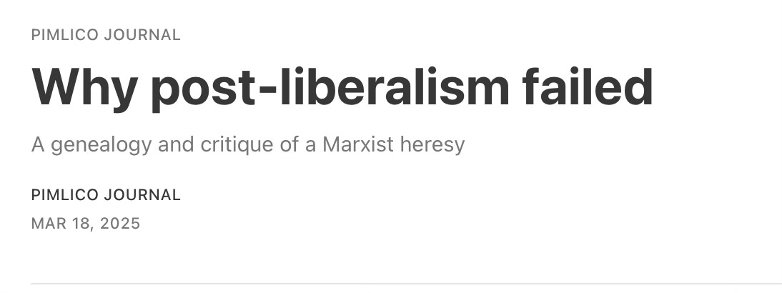 Postliberalism is a sociological proposition more than a political strategy — at least in the first instance. It’s way too early to gauge its long-term influence as a political movement or ideology. The “post liberals” have been astute and mostly correct about the terminal crisis of liberalism — the healthy, self-regulating market society of individuals sustained by a moderate but effective (nation) state. Whether we end up with something that looks like distributism (as per E.F. Schumacher/Illich — my preference) or the nightmare trans humanist machine (as per